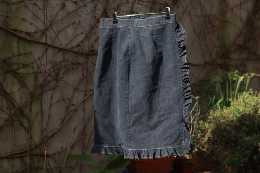Vintage Denim Ruffle Skirt Dark Wash Cotton Midi Skirt Frill Trim A-Line 90s
