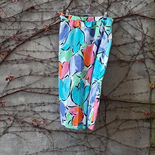 Vintage Floral Midi Skirt| 70s High Waisted Colorful Abstract Print A-Line Cotton