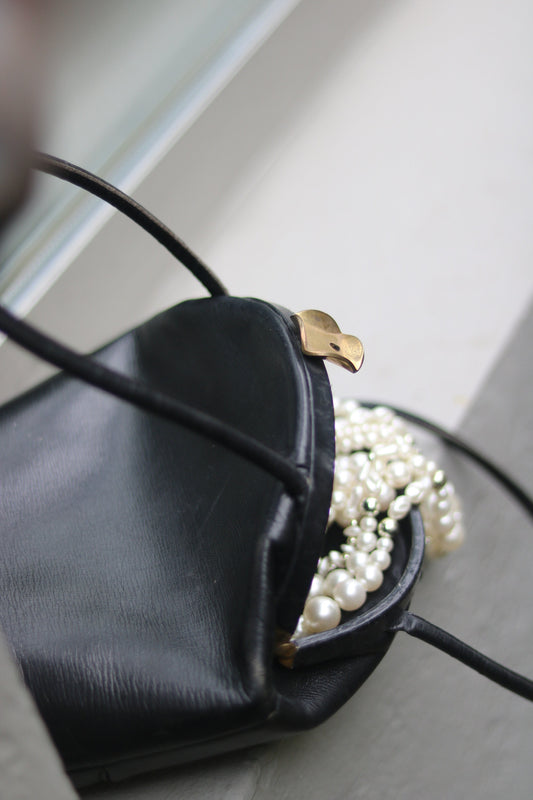 50s Vintage Black Leather Handbag| Women's Gold Kiss-Lock Clasp Purse| Retro Old Hollywood Glam Mini Bag