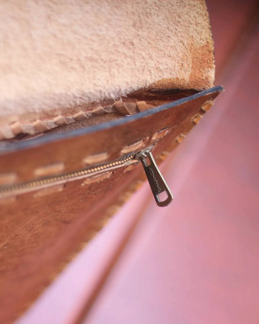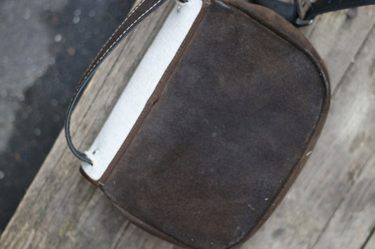 70s handmade leather bag| Vintage Leather Bag in Brown with statement suede patchwork details