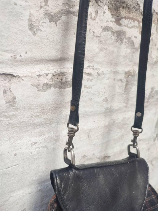 Vintage Mini Leather bag with statement brown details| 70s compact shoulder bag with striped lining| Minimalist small crossbody bag