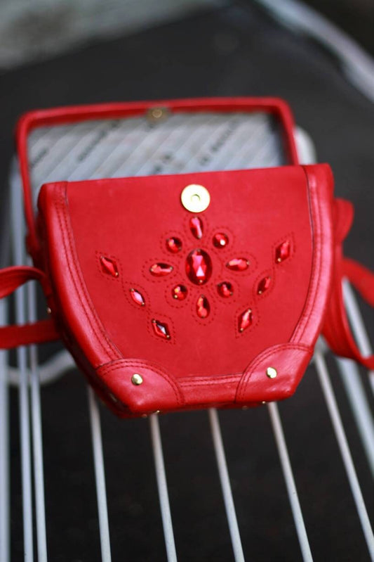 80s Il Saco leather red bag | Vintage studded handbag with embellished details| Glamorous mini handbag with crystal like details