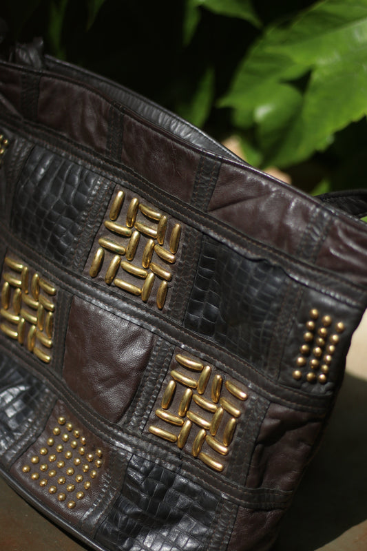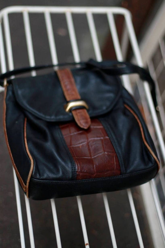 Vintage Black Bag with faux exotic details | Brown and black Shoulder bag with adjustable straps