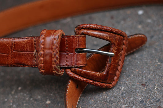Vintage Croc Embossed Brown Leather Belt: Handmade Italian Brass Buckle
