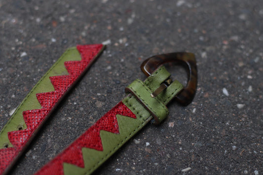 Vintage Red Green Chevron Leather Belt | Tortoiseshell Buckle | Bold Graphic Waist Belt | Unique Statement Accessory