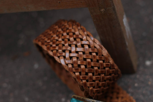 Vintage Braided Leather Belt with Turquoise Mosaic Buckle | Boho Western Statement Belt | Woven Brown Leather | Rustic Chic