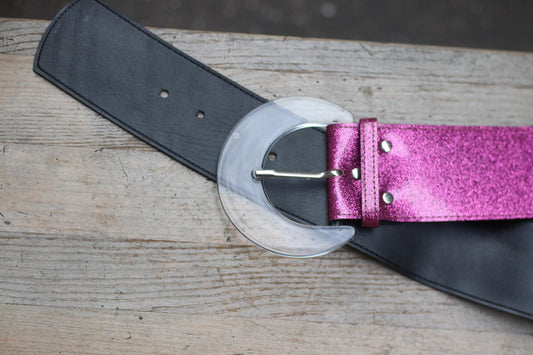 Y2K Magenta Glitter Belt, Wide Black Leather, Clear Half-Moon Buckle, Early 2000s Statement Accessory, Party Festival