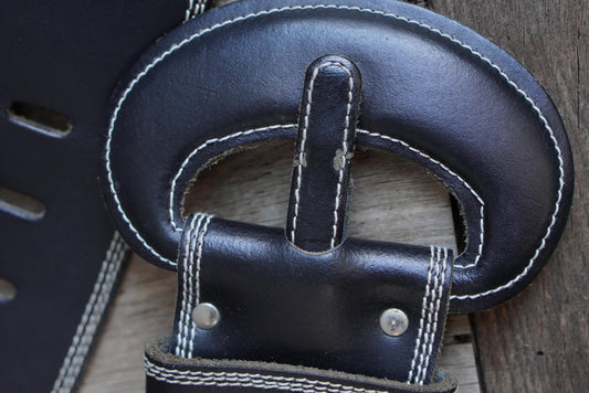 Y2K Wide Black Leather Cinch Belt: Oversized Buckle, White Stitch