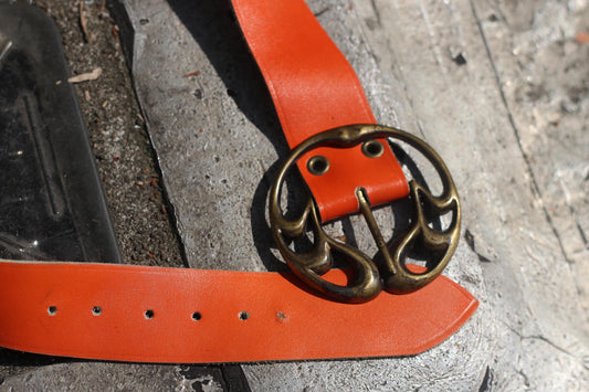 Vintage Orange Leather Belt, Wide Statement Belt, Ornate Brass Buckle, Women's Unique Accessory