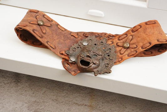 Vintage Folk Art Mask Belt Distressed Leather Tribal Belt Brass Deity Buckle 70s