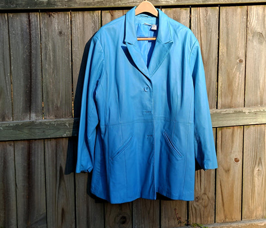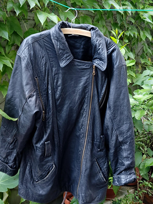 90s Blue Leather Jacket | Vintage Unisex Leather Coat| Minimalist Oversized Leather Jacket