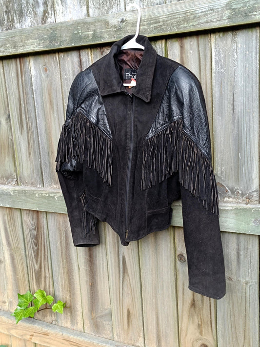 Phoenix Women's Suede Jacket| Vintage Black Cowgirl Fringed Cropped Coat| 80s Western-inspired Jacket