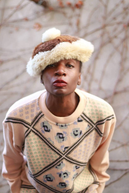 Rare Toscana Lamm Hat| Vintage Fuzzy Winter Hat | Unique white and brown cozy beret| Maximalist pom pom hat