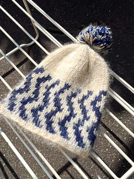Hand-knitted Winter Hat| Vintage Cozy Blue Winter Beanie | Unique white and blue winter accessory| Maximalist knitted pom pom hat