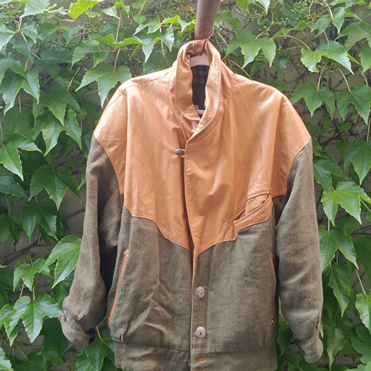 Vintage Leather & Linen Oversized Jacket| Unisex 90s Bomber Style in Tan Olive Green, Statement Outerwear, Retro Streetwear
