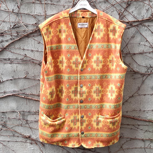 Vintage Southwestern Fleece Vest Orange Geometric Pattern Oversized Sleeveless Jacket