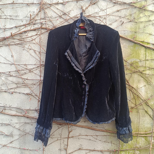 Vintage Silk Blend Velvet Blazer Black Gothic Victorian Ruffle Evening Jacket 38