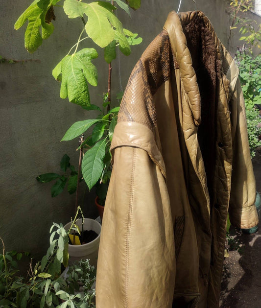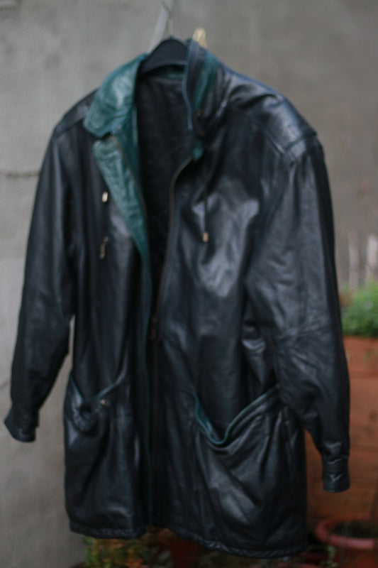 90s Leather Jacket with Statement Green Details| Vintage long leather Coat Streetwear inspired