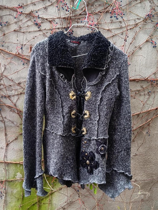 90s Grey Toggle Button Cardigan| Vintage Bell Sleeve Deconstructed Knit | Avant-garde Gothic Inspired Floral Detailed Winter Pullover