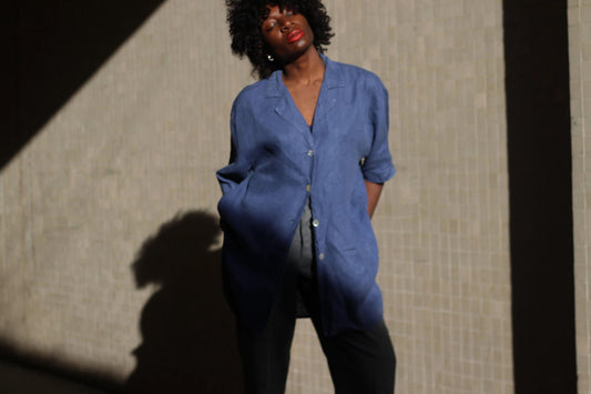 90s Linen Blouse| Vintage Einhorn Blue Oversized Women's Blouse|