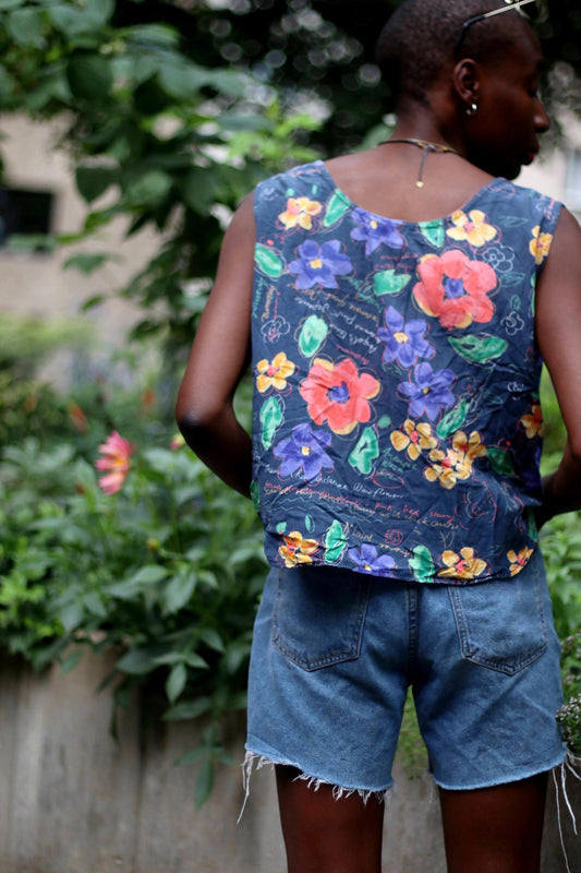 90s Floral Print Top| Vintage Miss JOY Sleeveless Blouse| Maximalist Summer Blouse | Bohemian Blue Top