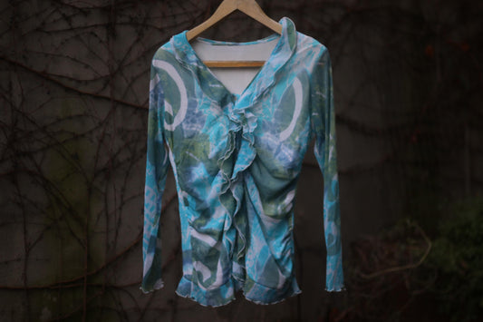 Vintage Y2k Ruffle Blouse in Blue and Green| Size S-M