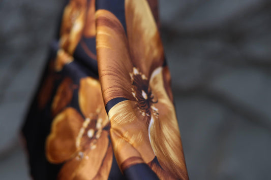 Vintage Floral Scarf| Golden Brown on Black Dark Academia Headscarf| 80s, lightweight Parisian Chic Old Hollywood Style