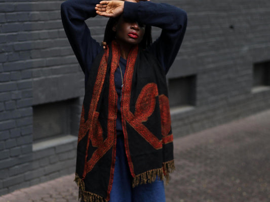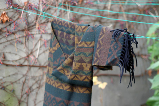 90s Boho Winter Scarf | Vintage Ethno Inspired Print Brown Scarf| Men's Oversized scarf with fringes