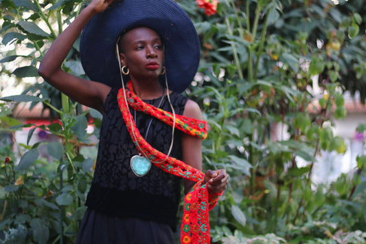 70s crocheted scarf| Vintage handmade colorful long scarf| red and orange flower power skinny scarf