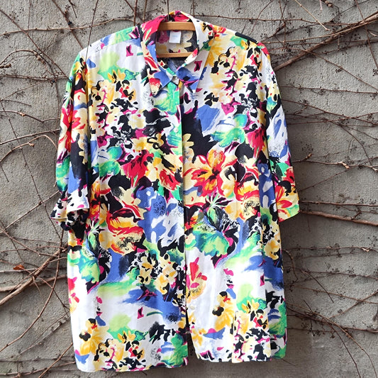 Vintage Abstract Floral Shirt Colorful 90s Oversized Blouse Painterly Print