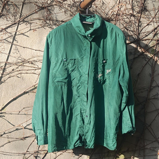 Oversized Silk Blouse Emerald Green 90s Vintage Shirt Embroidered Top L XL