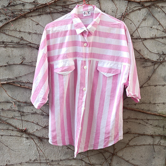 Pink White Striped Shirt Cotton Oversized Blouse Short Sleeve Button Up Top JOY