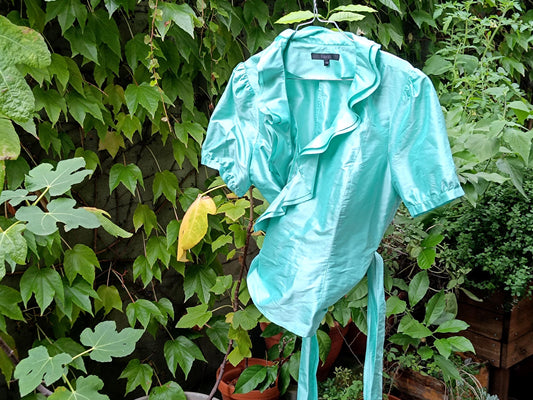 Vintage Coast Silk Blouse | 90s Teal Blue Women's Wrap Shirt | Minimalist Ruffled Top | Statement Shirt | Retro Fashion