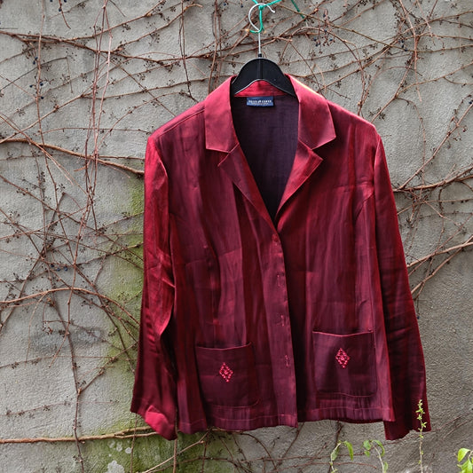 90s Vintage Shiny Red Blouse with Embroidered Pockets| Women's Button-up Satin-Like Shirt