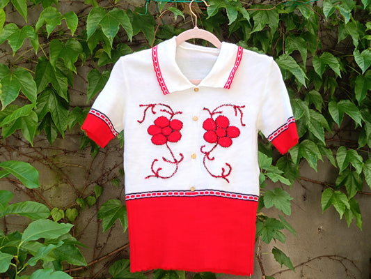Vintage 70s Red White Polo Shirt | Embroidered Knit Top | Short Sleeve Cottagecore Blouse Floral Detail