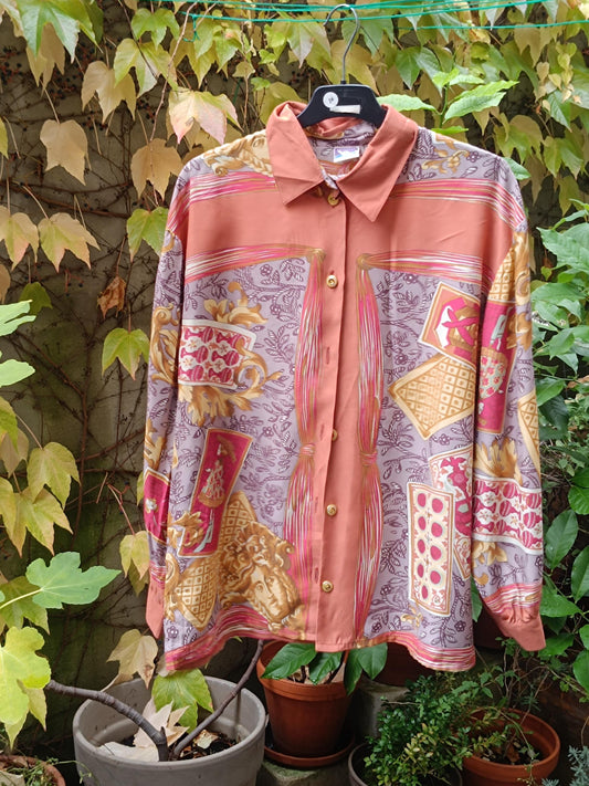 80s Crazy Print Blouse| Vintage Yessica Opulent Print Orange Buttoned Down Shirt | Women's Long Sleeved Shirt