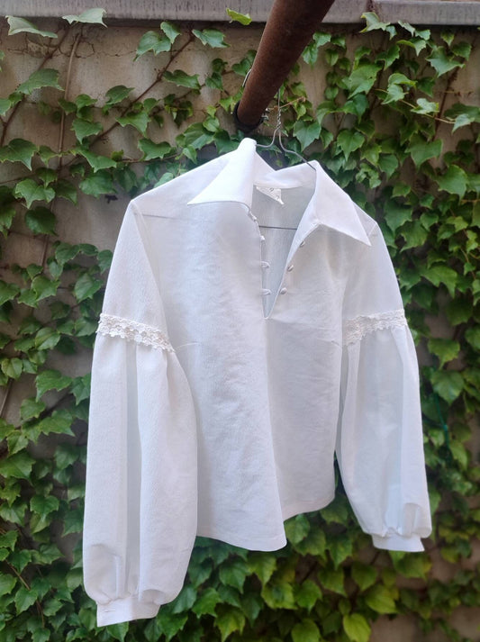 70s Blouse with Statement sleeves| Vintage White shirt with butterfly collar| Bohemian retro long sleeve blouse with statement floral detail