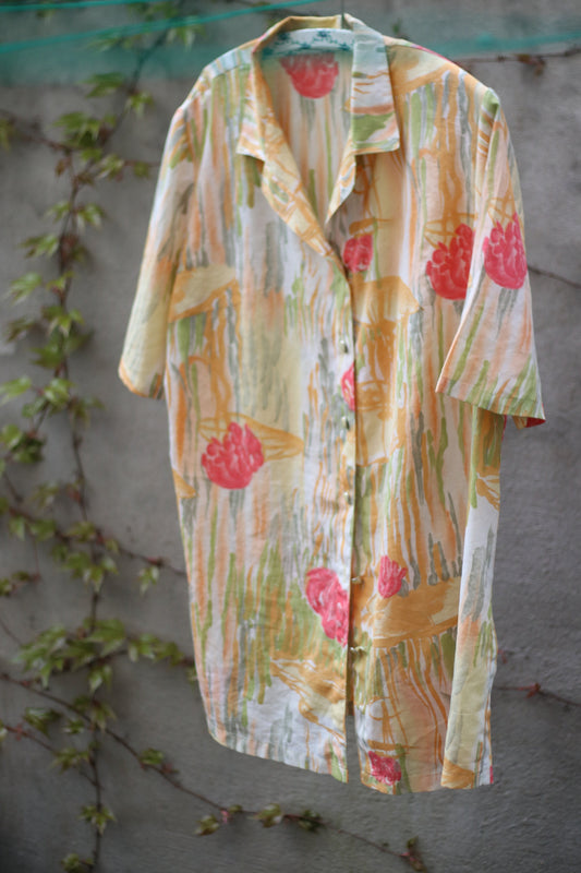90s oversized floral print Blouse or mini dress| Abstract print tunic| Summer hipster yellow and red shirt