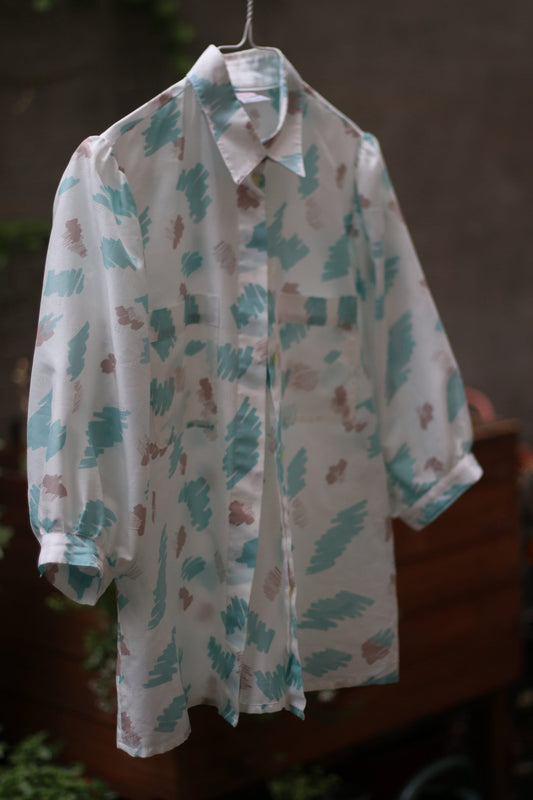 80s White Summer Blouse| Vintage short sleeves blue and white abstract print shirt| Frede modell blouse