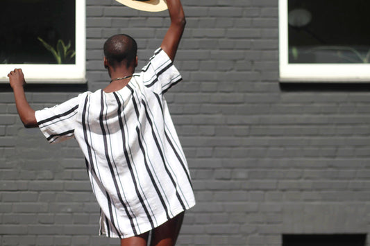 90s Striped linen blend top| Vintage Monochrome summer collarless shirt| Black and white oversized piece