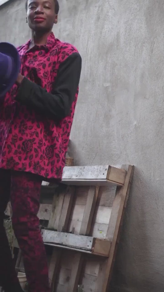 Vintage Long Sleeved Shirt with Floral Motifs in red and contrasting Black Sleeves