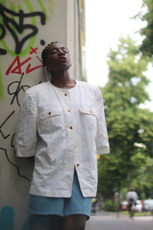 Vintage 80s White Blazer Shirt with Statement Buttons and Print Size Small