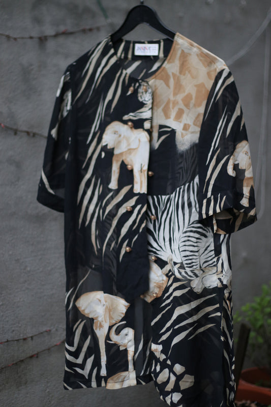 Vintage Sheer Blouse| 90s Janina Schreck Animal Print Buttoned down short sleeved monochrome shirt