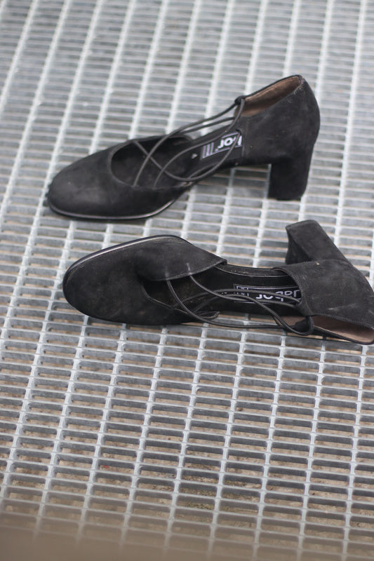 90s Gabor Suede Heels with Criss Cross Details| Vintage Classic Chic Elegant Black Block Heel Shoes | Capsule Wardrobe Minimalist Workwear