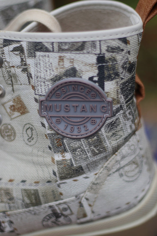 y2k Mustang Chunky Boots| Vintage grey canvas streetwear statement printed shoes