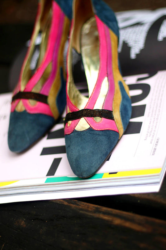 80s Beverly Feldman Pumps| Vintage Women's Rare Leather Multi-Colored Heels | Purple Black Maximalist Stilettos| Zigzag pattern Suede Shoes