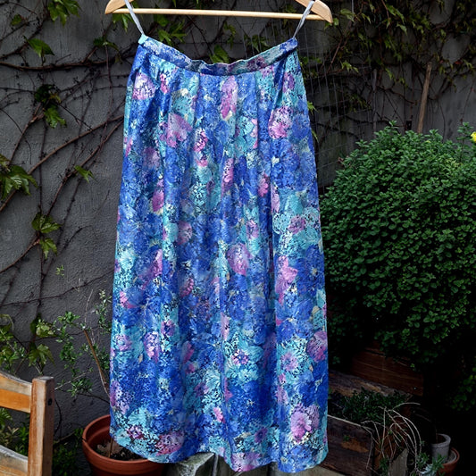 Vintage 90s Sheer Floral Midi Skirt – Blue Purple Watercolor Print, High Waist Flowing Mesh Overlay, Grunge Boho Cottagecore
