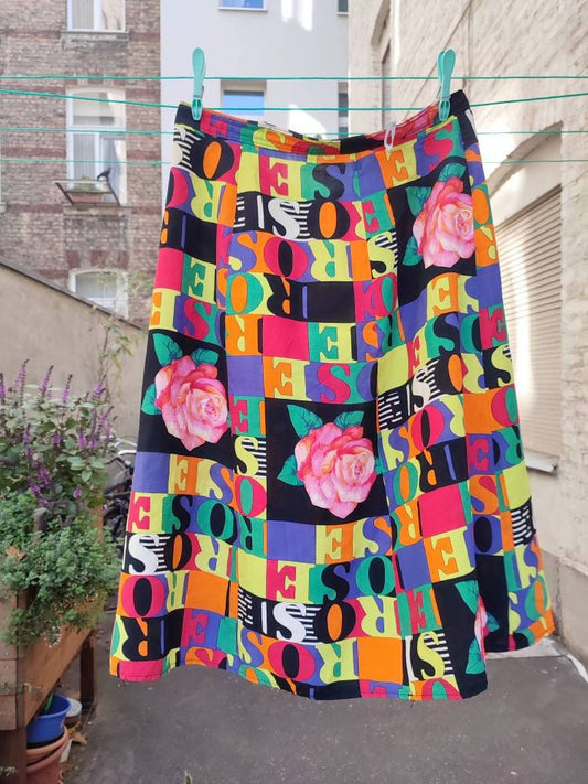 80s bold printed multicolored skirt| logomania vintage bold skirt in red, yellow and black