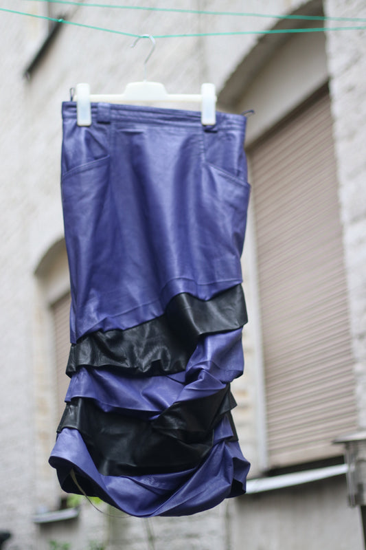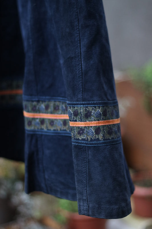 70s Blue Suede Skirt| Vintage Embroidered Country inspired blue and red bohemian skirt| Maximalist leather design