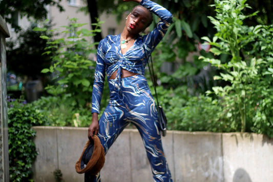 70s Two-Piece Trouser Suit| Vintage Women's Blue Suit with Psychedelic Print| Maximalist Women's Summer suit